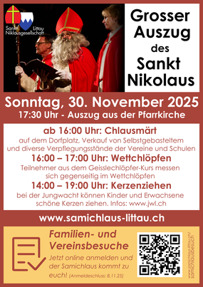 Schön war's am Sonntag, 1. Dezember 2024 - Der grosse Auszug des St. Nikolaus begeisterte jung und alt und leutete nicht nur die kommenden Samichlaustage sondern auch die Adventszeit ein. Begleitet war der Auszug von wunderschönen Iffelen, taktischen Trychlenklängen, schönsingenden Schüler/innen und fleissigen Laternenträger/innen und Kerzenkinder. Mit einer schönen Kindergeschichte erklärte der Samichlaus sein diesjähriges Motto "Teilen und danken" und nahm sich anschliessend für jedes Kind persönlich Zeit und freute sich auf die vielen Versli und Gedichte. Im Hintergrund versorgte der Chlausmärt die vielen Anwesenden mit warmen Getränken, feinen Köstlichkeiten und handgemachten Basteleien - und lud vor und nach dem Auszug zu einem gesellig Zusammensein ein.